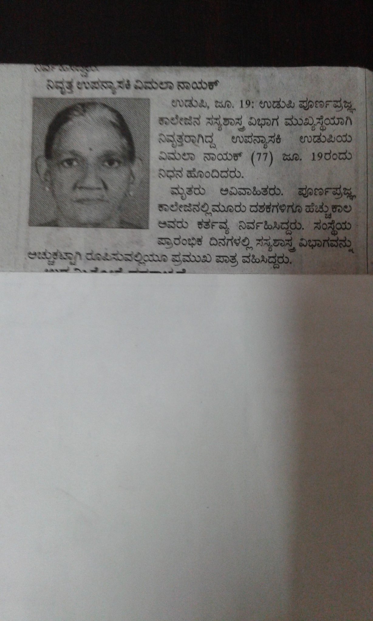 Pro. Vimala Nayak { 77 }, Retired H. O. D Deparment of BIOLOGY , Poornaprajna College , Udupi Expired on 19-6-2016.